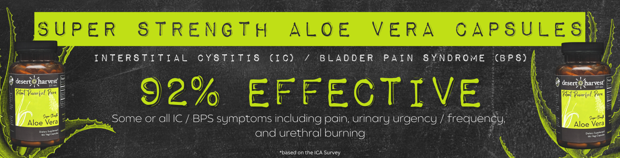 Desert Harvest Super-Strength Aloe Vera Capsules have been shown to effectively reduce bladder pain, urinary frequency, urinary urgency, and urethral burning that are a part of many bladder disorders, but especially Interstitial Cystitis (IC) / Bladder Pain Syndrome (BPS); sometimes referred to as non-bacterial prostatitis in men and chronic pelvic pain in women.