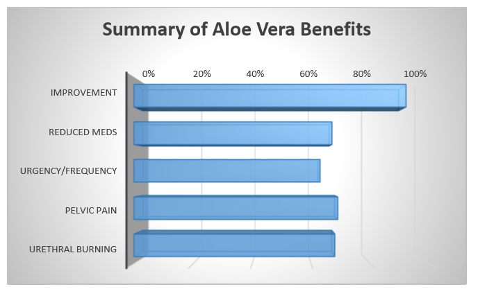 - 92% of patients self-reported that they ‘experienced relief’ with concentrated oral aloe vera. 63% of patients reported substantial improvement in urgency and frequency of urination. 69% of patients reported substantial improvement in pelvic pain. 68% of patients reported substantial improvement in urethral burning